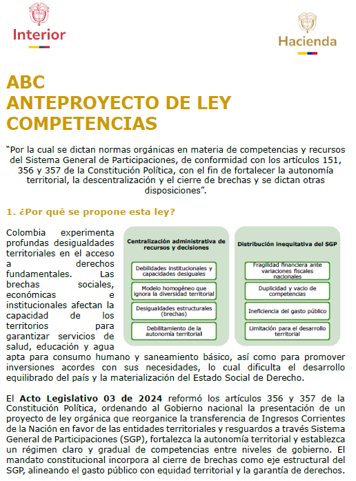 “Por la cual se dictan normas orgánicas en materia de competencias y recursos del Sistema General de Participaciones, de conformidad con los artículos 151, 356 y 357 de la Constitución Política, con el fin de fortalecer la autonomía territorial, la descentralización y el cierre de brechas y se dictan otras disposiciones”.