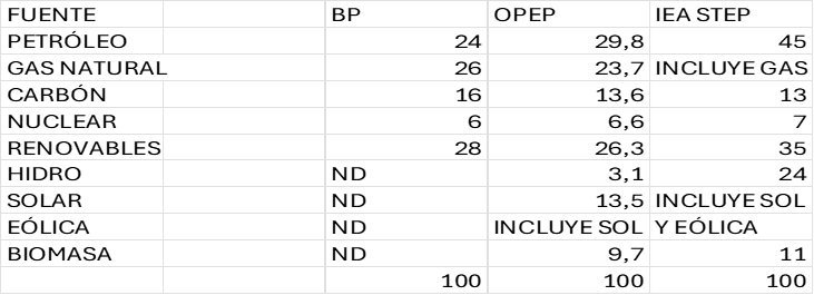 Son muchas las proyecciones que se hacen en el mundo de diferentes entidades, así como son muchos los supuestos que se hacen que dan lugar a resultados muy dispares. En esta forma, hay proyecciones que muestran que los combustibles fósiles seguirán predominando hasta el año 2050 y más allá. Y otros, que afirman que los combustibles fósiles caerán fuertemente de 2025 al 2050. Estos últimos responden a escenarios en que se fuerza a que la temperatura no subirá más de 2o C. Bajo estas circunstancias, el modelista produce, obligatoriamente, para que se de este estado, cambios en el uso de los combustibles fósiles e incrementa el uso de fuentes renovables de energía no convencionales, como energías solar y eólica. Son escenarios voluntaristas (Cuadro 1).