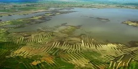 Sistema de drenajes y camellones de la cultura Zenú. Canales artificiales que facilitaban el drenaje de las aguas. Estos son vestigios de aquel sistema hidráulico que persisten en la actualidad. Fuente: Plazas y Falchetti, 1986.