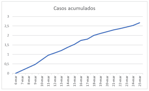 En la gráfica 1 se muestra la evolución de los casos acumulados en forma logarítmica que permite apreciar mejor las tendencias en cuanto a tasas de crecimiento, que es lo que importa. Claramente hay una tendencia creciente porque estamos en la fase inicial de aumento, con pendiente creciente, de ahí que es de esperar en las próximas dos semanas se llegue a infectados por el orden de 3500 personas.