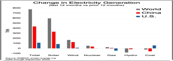Debemos esperar también que la diferencia de ingresos y de condiciones de vida entre los más ricos y el resto de la sociedad y de esta con los más pobres crecerá aún más dramáticamente por el cambio climático. Igualmente mencionamos que, gracias a los avances tecnológicos y científicos en energías renovables, que se han acelerado enormemente en los últimos años por el interés de combatir el cambio climático, que han crecido impresionantemente en los últimos años, especialmente en la China, que hoy lidera de lejos tanto la energía solar como la eólica y está abordando con mucha fuerza también la energía nuclear; la gráfica 1 ilustra al respecto. Es evidente la superioridad China de manera superlativa en la generación de electricidad y la tendencia a generar cada vez más con tecnologías solar, de viento, nuclear, mientras que estaría decreciendo la generación con gas, hidroeléctricas y carbón, aunque se siguen instalando, pero en menor cantidad relativa.