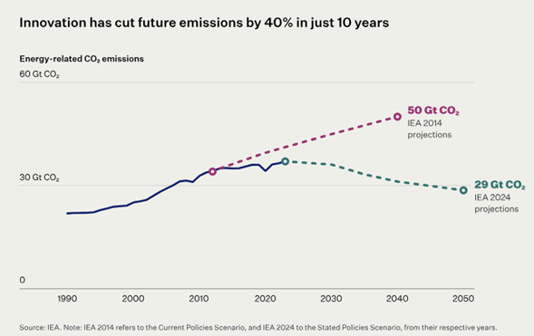 La AIE, agencia internacional de energía muestra que se lograría un 40% de disminución de las emisiones de gases de efecto invernadero hacia 2040, gracias a los avances actuales, pues de una proyección de 50 mil millones de toneladas emitidas anualmente podríamos lograr, con las tecnologías existentes, emitir sólo una cantidad de 30 mil millones; esto es muy importante, porque demuestra que de alguna manera se activó la competencia por encontrar y ofrecer alternativas energéticas sin daño ambiental como los combustibles fósiles y ya no tiene reversa.