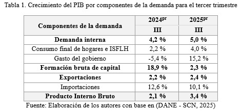 La economía colombiana durante el tercer trimestre de 2025 registró un crecimiento del Producto Interno Bruto del 3,4 % con respecto al mismo período de 2024 y, en línea con lo presentado al cierre del año anterior, sigue consolidando una lenta, pero firme recuperación dentro de la estabilidad macroeconómica que siempre ha caracterizado al país (Gráfica 1). Por el lado de la demanda, la consolidación de la recuperación de la economía se explica por la expansión del consumo de los hogares (4,0 %), cuyo peso sigue siendo de alrededor de ¾ parte del PIB (76,7 %), así como por la formación bruta de capital (2,3 %), cuyo aporte fue del 18 % del total del producto (Tabla 1). Se constituyen entonces dos fuentes nuevas de crecimiento, esto es el consumo y la inversión, reflejando un comportamiento sólido hacia los períodos siguientes.