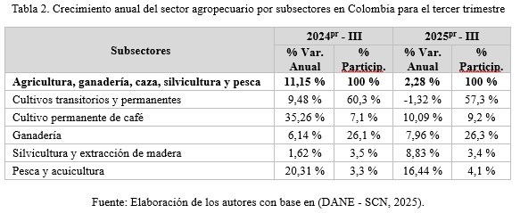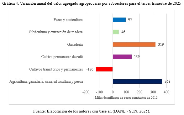 En el caso de los cultivos agrícolas transitorios y permanentes, el crecimiento fue negativo y equivalente al 1,32 % anual (126 mil millones de pesos constantes menos), lo cual fue compensado por la ganadería y el cultivo permanente de café, los cuales crecieron con respecto al mismo período de 2024 en 7,96 % (319 mil millones más) y 10,09 % (139 mil millones más).