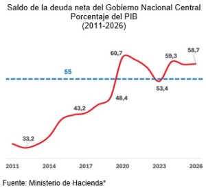 La tendencia del saldo de la deuda neta del Gobierno Nacional Central (GNC), como porcentaje del PIB, ha aumentado de manera sistemática. En el 2012 era 33,2%, y la estimación para el 2026 es de 58,7%. Este crecimiento es significativo, y para cumplir con estas obligaciones, este año el servicio de la deuda estará alrededor de $103 billones, que incluye intereses y amortización a capital. Solamente en intereses se deberán pagar $60 billones.