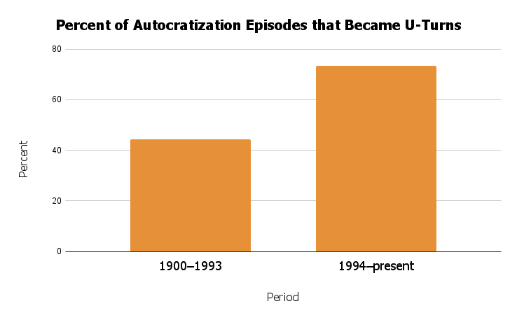 Existe además una quinta razón, menos comentada, para evitar la desesperación: los episodios autoritarios en el extranjero tienden a fracasar. Un estudio reciente de Marina Nord y cuatro coautores analizó todos los episodios autoritarios desde 1900 y descubrió que un número sorprendentemente elevado se ha detenido y revertido en un plazo de cinco años, un proceso que denominan «giros en U». Su estudio reveló que «el 52 % de todos los episodios de autocratización se convierten en giros en U, porcentaje que aumenta al 73 % al centrarse en los últimos 30 años» (véase la figura 1).