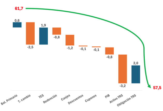 La tasa de cambio contribuyó a reducir la deuda en ‑2,5 puntos del PIB. La apreciación del peso con respecto al dólar abarata el costo de la deuda externa porque se requieren menos pesos para cumplir con los compromisos en dólares. El resultado neto del manejo de TES incrementó la deuda en 1,9 puntos. Su rendimiento está alrededor del 11% anual. Además, se observa en la gráfica una combinación de redenciones, canjes, descuentos y cupones. Posteriormente, el crecimiento del PIB, que fue mayor de lo esperado, reduce la relación deuda/PIB porque el denominador aumenta. Este efecto es de 0,8 puntos. También incidió en la disminución del saldo, las operaciones de intercambio de deuda (swap) que tuvieron un efecto neto positivo. La combinación de la TRS (total return swap) fue favorable porque redujo la deuda en ‑1,2 puntos (‑3,2+2,0=‑1,2). El resultado final de la combinación de estos factores es un saldo de deuda de 57,5% del PIB.