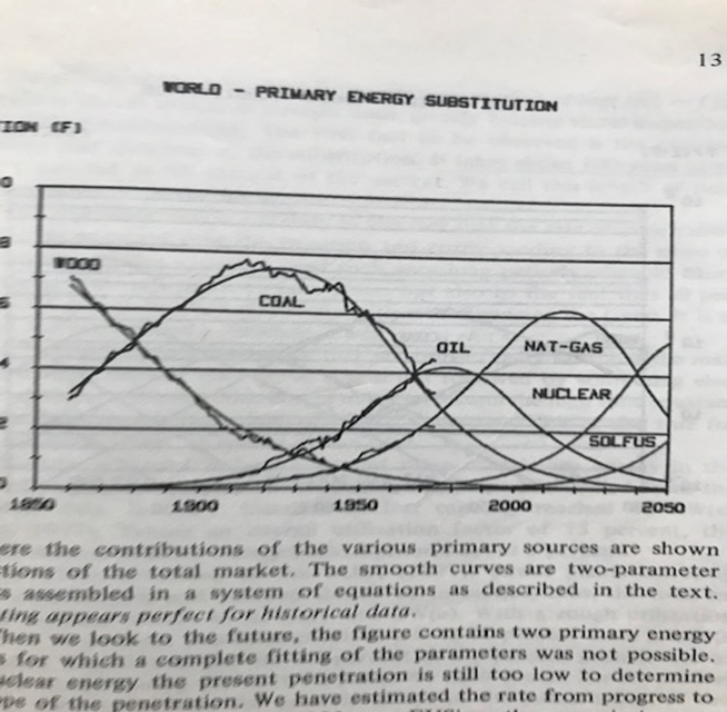 En la gráfica 1 se presenta la participación de las fuentes de energía a nivel mundial realizada por C. Marchetti and N. Nakicenovic de la International Institute for Applied Systems Analysis- IIASA, en diciembre de 1979, con proyecciones hasta 2050, estudio efectuado en los setenta del siglo XX. Las proyecciones muestran una caída fuerte del petróleo el carbón, y un aumento del gas natural y las energías nuclear, incluyendo fusión, y solar de acuerdo con lo que se veía en esos años.