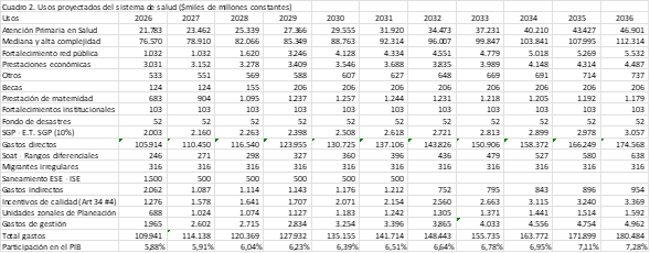 De acuerdo con el Ministerio de Salud, hay una canasta de 15 usos proyectados del sistema de salud (cuadro 2, tabla 1 del documento), 10 corresponden a los gastos directos, 3 a los indirectos y 2 a la gestión. Los gastos directos se estiman, en promedio, en el 96.7% de los gastos totales del sistema, de los cuales el más representativo es la atención en mediana y alta complejidad, que hoy es el 69.6% de los gastos totales y se proyecta con un promedio del 65.6% con la reforma, llegando al 62.2% en el 2036. La Atención Primaria en Salud APS es el segundo componente, hoy con el 19.8% de los gastos totales que, con la reforma se proyecta llegar al 26% en el 2036, con un promedio para la década del 22.7%. Los dos componentes principales del sistema suman, en promedio el 88.2% de los gastos totales, que se mantiene en la década y el efecto de la reforma es el rebalanceo de su participación en el gasto, sube la APS y baja la mediana y alta complejidad, ese es el trasfondo del debate.