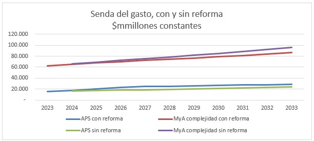 La gráfica recoge una comparación entre las proyecciones de gasto, con y sin reforma, incluida en el documento inicial, de “escenarios de factibilidad” a precios del 2023, donde se observa la tendencia de aportar mayor cantidad de recursos para mediana y alta complejidad sin reforma, respecto a lo que recibiría con reforma, alrededor de $10 billones de diferencia para el 2033, mientras sucede lo contrario con la APS, que recibe más recursos con reforma que sin ella.