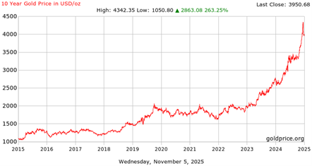 Ilustración 1. Evolución de los precios del oro en los últimos 10 años. Tomado de: https://goldprice.org/gold-price-history.html