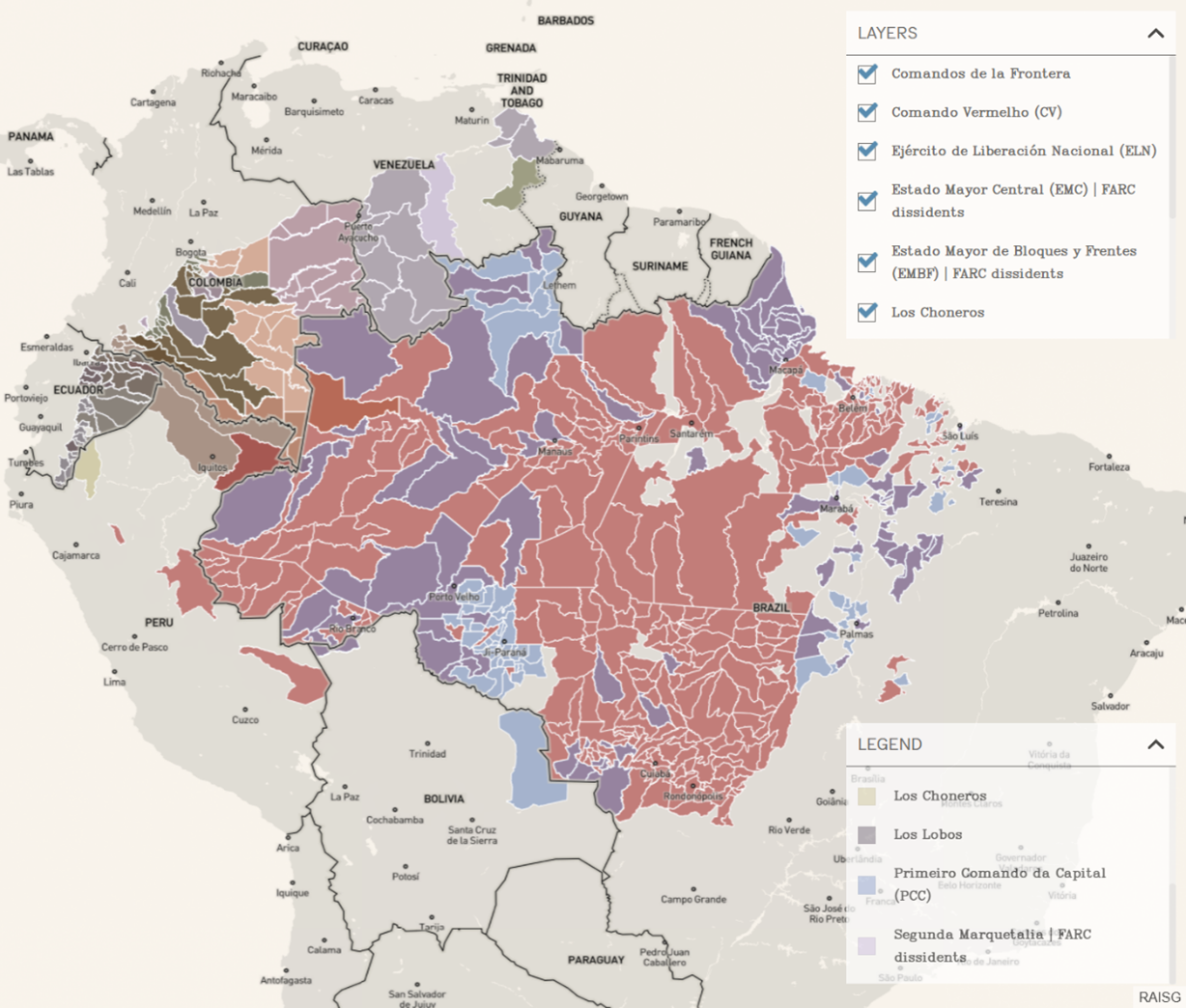 Ilustración 2. Mapa de presencia de organizaciones criminales y grupos armados en la Amazonía. Tomado de: https://amazonunderworld.org/map/
