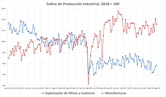 Como se aprecia en el gráfico 1, el Índice de Producción Industrial (IPI) ejemplifica el cambio de motor que ha tenido la economía a partir de la recuperación postpandemia. Si bien el crecimiento del IPI respecto a agosto de 2018 es tan sólo del 2,6%, al revisar sus componentes (minas y canteras, manufactureras, electricidad, gas y agua), es claro que ha habido una recomposición orientada hacia la producción manufacturera (rojo) como principal motor de la recuperación industrial. La explotación de minas y canteras ha caído 24,2% desde agosto del 2018, mientras que la producción de manufacturas ha crecido 9,5%.