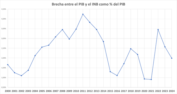 crecimiento del PIB, pero también con una brecha significativa entre el Producto Interno Bruto (PIB) y el Ingreso Nacional Bruto (INB). Este último mide el ingreso que finalmente queda en manos de los residentes, una vez se descuentan las rentas factoriales que salen del país (en particular el giro de las utilidades), y se suman las provenientes del exterior.