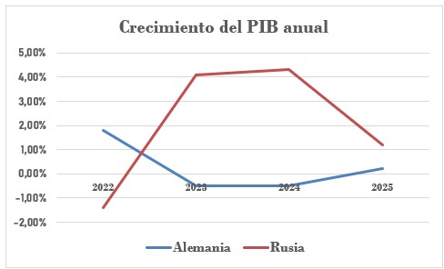 Gráfico 1: Evolución del PIB de Rusia vs Alemania (2022-2025*).
