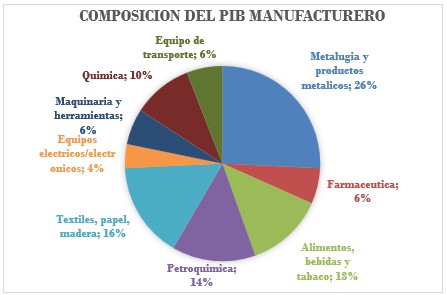 El sector manufacturero representa aproximadamente el 14 % del PIB total, mientras que la industria militar aporta aproximadamente el 5 % del PIB. En cuanto al PIB manufacturero de carácter civil, su composición por subsectores es la siguiente:
