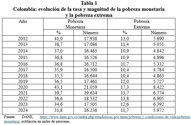 El análisis de la evolución de las cifras de pobreza enfrenta dificultades debido a que a comienzos de la década se cambió la metodología y no hay datos oficiales de pobreza para 2006 y 2007. El Departamento Administrativo Nacional de Estadística (DANE) ofrece en su página web datos con la nueva metodología para 2012-2024, que coincide con parte del período de gobierno de derecha de Juan Manuel Santos (2010-2018) y de Iván Duque, extrema derecha (2018-2022). En este período se observa lo siguiente.
