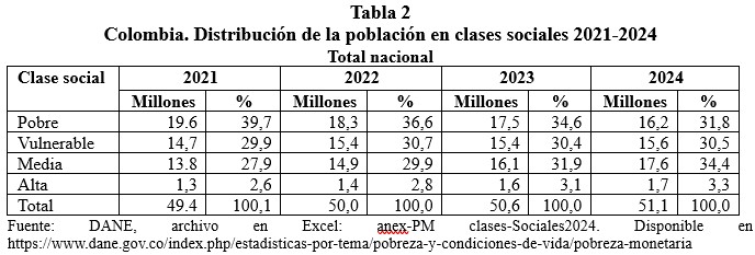 De acuerdo con el DANE: 1) Disminuyó la clase baja (suma de la población pobre y la población vulnerable), pasó de 69,6% del total (34,3 millones de personas) a 62,3% (31,8 millones); este resultado combina la reducción de la población pobre (que pasó a vulnerable) y de la vulnerable (que pasó a media); 2) Aumentó la clase media: pasó de 27,9% del total de la población (13,8 millones de personas) a 34,4% (17,6 millones de personas), un aumento significativo; 3) Aumentó ligeramente la clase alta pasando de 2,6% (1,3 millones) a 3,3% (1,7 millones).[5] El aumento de la clase media es uno de los propósitos declarados de algunos técnicos y analistas promotores del capitalismo en Colombia y destacado como una prueba de progreso en este modo de producción.
