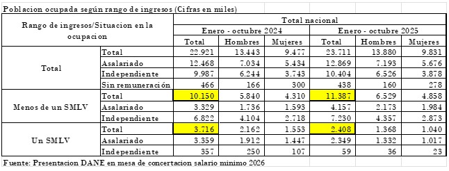 Según información del DANE presentada en la mesa de concertación del salario mínimo de 2026, entre enero y octubre de 2025, el país registró 23,7 millones de personas ocupadas. La distribución salarial fue la siguiente: