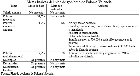 Es claro que Valencia no se compromete con medidas directas de incremento del salario monetario y de un ingreso básico para los trabajadores no asalariados. Ofrece tomar el camino de medidas indirectas de complementación del ingreso, la gran mayoría acciones muy vagas e imprecisas. No aparece en el plan de gobierno una sola referencia a la desnutrición, al hambre y a la inseguridad alimentaria. Parecería que este problema ya está resuelto y no merece ser siquiera mencionado.