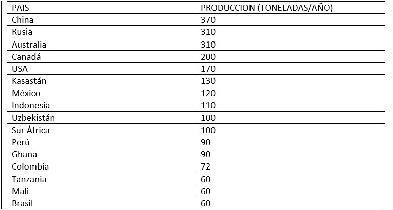 TABLA 1. PRODUCCION MUNDIAL Y POR PAÍS DE ORO.