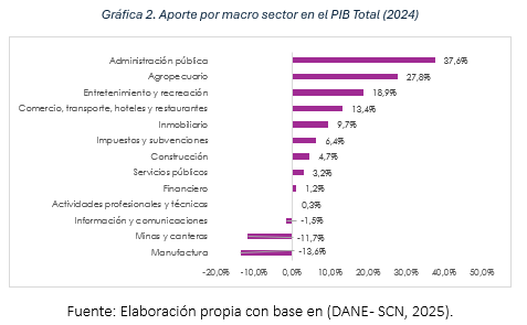 A nivel de los macro sectores de la oferta agregada, se evidencia que los jalonadores del crecimiento de la economía fueron la administración pública, el sector agropecuario y las actividades de entretenimiento y recreación, así como lo referente al comercio en general. Como se evidencia en la Gráfica 2, la variación positiva del 1,74 % se explica en un 37,6 % por el valor agregado de la administración pública, mientras que en un 27,8 % se debe al sector agropecuario; por su parte, las actividades de entretenimiento y recreación contribuyeron con un 18,9 % del total, seguido de las actividades del sector comercio con el 13,4 %. No obstante, es innegable la preocupación por el aporte negativo al crecimiento económico de la explotación de minas y canteras y de las industrias manufactureras durante 2024, lo que necesariamente deja un sabor agridulce, dada la importancia para la economía colombiana, tanto para los mercados internos como para las exportaciones. No obstante, deberá ser parte de un análisis posterior el comportamiento ya estructural de la desindustrialización en el país, fenómeno que han querido negar los diferentes hacedores de política.