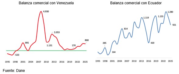 La balanza con Ecuador ha sido volátil, pero presenta una tendencia claramente ascendente. El superávit en el 2025 fue de US921 millones. La disputa arancelaria no resuelve los problemas que existen entre los dos países y, en cambio, se traduce en una pérdida de la capacidad de pago de los hogares de ambos países.