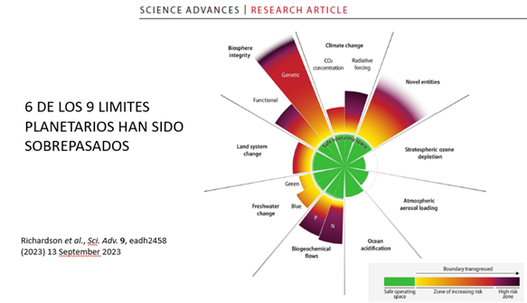 Muchos investigadores e intelectuales se refieren al Antropoceno y otros, menos numerosos, al Capitaloceno, como la era de la tierra en la cual las acciones antrópicas, movidas por el mercado de bienes y servicios que se desató en la revolución industrial inglesa, con la motivación principal de acumular riqueza monetaria y económica; está resultando en el franco y grave deterioro y desaparición de la riqueza natural de la tierra. El problema sigue creciendo a una velocidad e intensidad impresionantes, hasta el punto que siete de los nueve límites planetarios han sido sobrepasados, pues, aunque la gráfica 1, de 2023 muestra sólo seis, también el de la acidificación de los océanos ha sido sobre pasado ya.