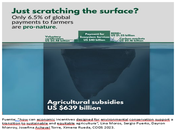 Uno de los sectores más vulnerados por la visión convencional de la economía neoclásica es precisamente el agropecuario; la gráfica siguiente muestra la enorme diferencia entre los subsidios perversos y los orientados a protegerla y usarla responsablemente.