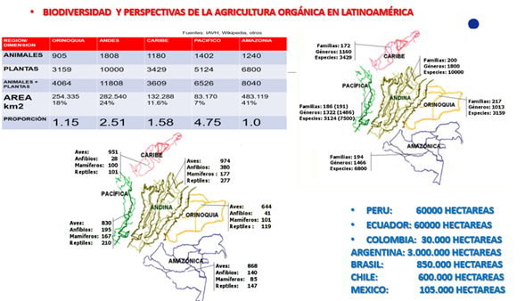 GRAFICA 1. Diferencias de densidad de la biodiversidad por km2 en las cinco regiones colombianas y Area bajo agricultura Orgánica por país latinoamericano.