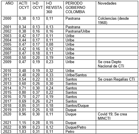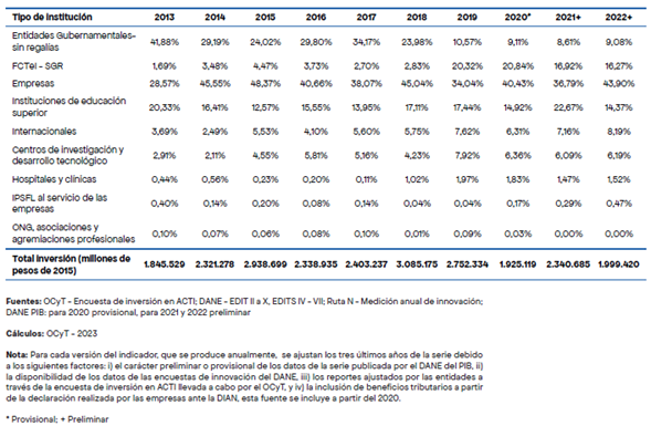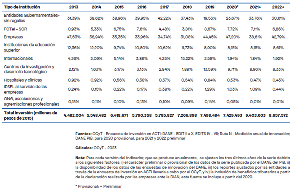 El periodo 2009 en adelante significa un cambio institucional de Colciencias a Departamento Administrativo de Ciencia, Tecnología e Innovación; mientras que de 2013-2022 es importante pues entran las regalías para ciencia, tecnología e innovación a partir de 2012, aunque sólo empiezan a ejecutarse en 2013. La tabla 1 señala un aporte creciente que alcanzó un 8,67% en 2019 y se redujo a 6,86% en 2022 en ACTI. La creación del Ministerio de Ciencia, Tecnología e Innovación ocurre en 2020. Esos son los hitos institucionales históricos, que no se reflejan sustantivamente en un aumento significativo, que cambie el orden de magnitudes de la apuesta por el conocimiento.