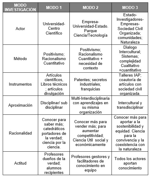 En la misma línea de pensamiento, proponemos considerar los tres modos de construcción de conocimiento, que hemos incluido en la construcción del IDTS ( índice de Desarrollo Territorial Sustentable) para Colombia, encontrando que tienen sentido: Modo 1 o científico, que se expresa en conocimiento explícito a través de artículos científicos y libros; Modo 2 o de conocimiento tácito que se expresa en las innovaciones validadas en el mercado y por lo tanto responde a la lógica de la competencia; y Modo 3, de carácter colectivo, en el cual los ciudadanos pueden ser coautores, coinvestigadores de su realidad en una visión de la “investigación e innovación abierta”, que es finalmente el entorno de una sociedad que reclama la solidaridad, la convivencia y la ética de compartir, frente a una dinámica mundial de mayor inequidad (Piketty, Acemoglu y Robinson, etc.); La sociedad se beneficia en la medida en la cual permita la coexistencia balanceada de los tres modos de conocimiento ante un futuro complejo e incierto en el cual el cambio climático, la evolución de la producción mundializada y automatizada, las modificaciones de las fuentes y tecnologías energéticas, hacia energías renovables y las tensiones socioeconómicas, culturales y políticas requieren un entendimiento más complejo y universal. La Tabla 1 presenta estos componentes: