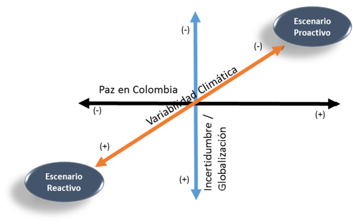 - Primer escenario “PROACTIVO”: no se logra la paz en la forma esperada en Colombia; hay alta incertidumbre y complejidad internacional tanto política como económica; los efectos del cambio climático son severos en países tropicales.