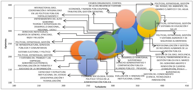 En el caso de los administradores públicos, teniendo en cuenta que la Administración Pública es una también una ciencia estratégica y de síntesis (como la geografía en lo espacial), que debe prever de alguna manera el futuro, se solicitó, bajo la metodología de “escenarios futuros posibles”, que los participantes imaginaran por lo menos dos escenarios para evaluar las acciones que se deben acometer para enfrentarlos de la manera más sustentable posible en el “post-conflicto”. Se usaron escenarios similares a los del ejercicio de Colciencias. Una revisión exhaustiva de las líneas de investigación que adelantan los programas de doctorado en Administración Pública, Políticas, Asuntos Públicos y Gobierno a nivel internacional y de los temas principales del CLAD sobre innovaciones en la gestión pública, permitió construir el listado de temas que fueron evaluados mediante talleres Ad Hoc de expertos, en los cuales se contó con la asistencia voluntaria de varios profesores investigadores de la ESAP y otras Instituciones, y se “tamizaron” todos los temas, identificando, agrupándolos y sintetizándolos en una lista manejable de 20 temas. Este ejercicio colectivo se complementó con la revisión individual por separado y nuevamente se reunieron los expertos invitados con el grupo investigador para formalizar la tabla del listado temático que se enviaría a consulta a los profesionales de administración pública del país.