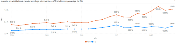 Gráfica 2. Inversión en ACTI y en I+D como porcentaje del PIB Colombia 2000-2023