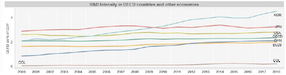 En el caso de Colombia, se puede observar en el trabajo juicioso del OCyT, que, tanto en I+D como en ACTI, existe un evidente aumento, muy moderado, en las cifras para los veinte años. I+D tiene, para esos veinte años una tasa de crecimiento anual compuesta (CAGR, por su sigla en inglés) de 3.88% (pasando de 0.13% del PIB en el año 2000 a 0.28% en 2019); mientras que en ACTI la CAGR para los veinte años es de 3.37%, pasando de 0.38% en 2000 a 0.74% en 2019. Es posible desagregar esta información por década, lo que muestra, para 2000-2009 un CAGR de 3.97% para I+D y 2.09% para ACTI; mientras que para la segunda década (2010-2019) es de 3.78% para I+D y 4.40% para ACTI. Por su puesto, aunque el país ha aumentado paulatina y modestamente la inversión en conocimiento e innovación, no se compadece con el abrumador aumento de China y el tradicional valor que asignan los demás países mencionados. Un primer período de doce años (2000-2011), en donde se observa un aumento sostenido pero moderado (CAGR de 3.52% para I+D y 1.97% para ACTI), luego se ve una período de cuatro años (2012-2015) de un aumento importante en las participaciones (CAGR de 9.93% para I+D y 10.14% para ACTI) y cuatro años, 2016-2019, de una relativa estabilidad con un pequeño descenso (CAGR de -1.32% para I+D y -0.39 para ACTI), el cual es posible que no baje, una vez se corrija la información de 2019 (que se hará en el operativo 2020).En los veinte años de la serie presentada por el OCyT, las ACTI se han financiado cerca del 53% en promedio con recursos públicos, un poco más del 44% con recursos privados y casi el 2,5% con recursos internacionales. Sin embargo, para los últimos cinco años (2015-2019), las cargas se han igualado y la financiación pública es del 49% en promedio, la privada de un poco más del 48% y la financiación internacional ligeramente inferior al 3%. Gracias, sobre todo, a la inversión empresarial, la financiación pública y la privada en ACTI son prácticamente iguales.