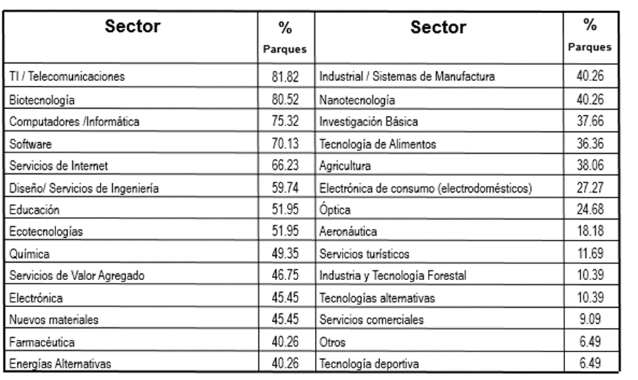 Tabla 1. Áreas de especialización de una muestra de 400 Parques de Ciencia y Tecnología a nivel mundial. Fuente: Asociación Internacional de Parques Tecnológicos 2006.