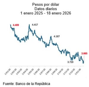 Las razones que podrían estar explicando la caída del dólar son: i) La pérdida de valor en el mercado internacional, representada en el movimiento a la baja del índice DXY. ii) El aumento de las remesas. En el 2025 estuvieron cercanas a US14 mil millones. Una cifra superior a los ingresos de café (US5 mil millones) y petróleo (US13 mil millones). iii) La cocaína y la minería ilegal. El monto de los recursos que entran por coca podría ser del orden de US15 mil millones al año. iv) El acelerado endeudamiento del gobierno en los últimos 4 meses, que se ha traducido en la entrada de montos significativos de dólares. v) La entrada de dólares por las exportaciones de productos como petróleo, café, flores, carbón…. Los hidrocarburos y los minerales representan el 60% de la balanza exportadora.